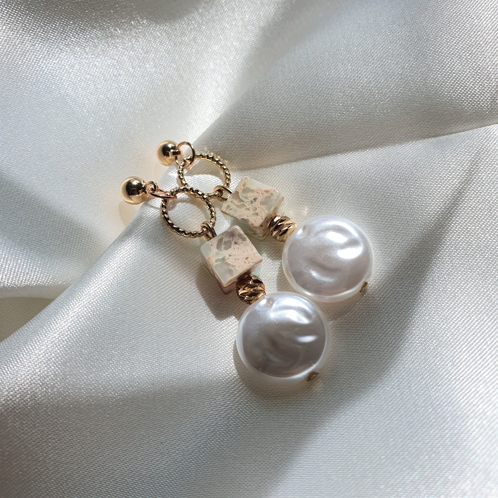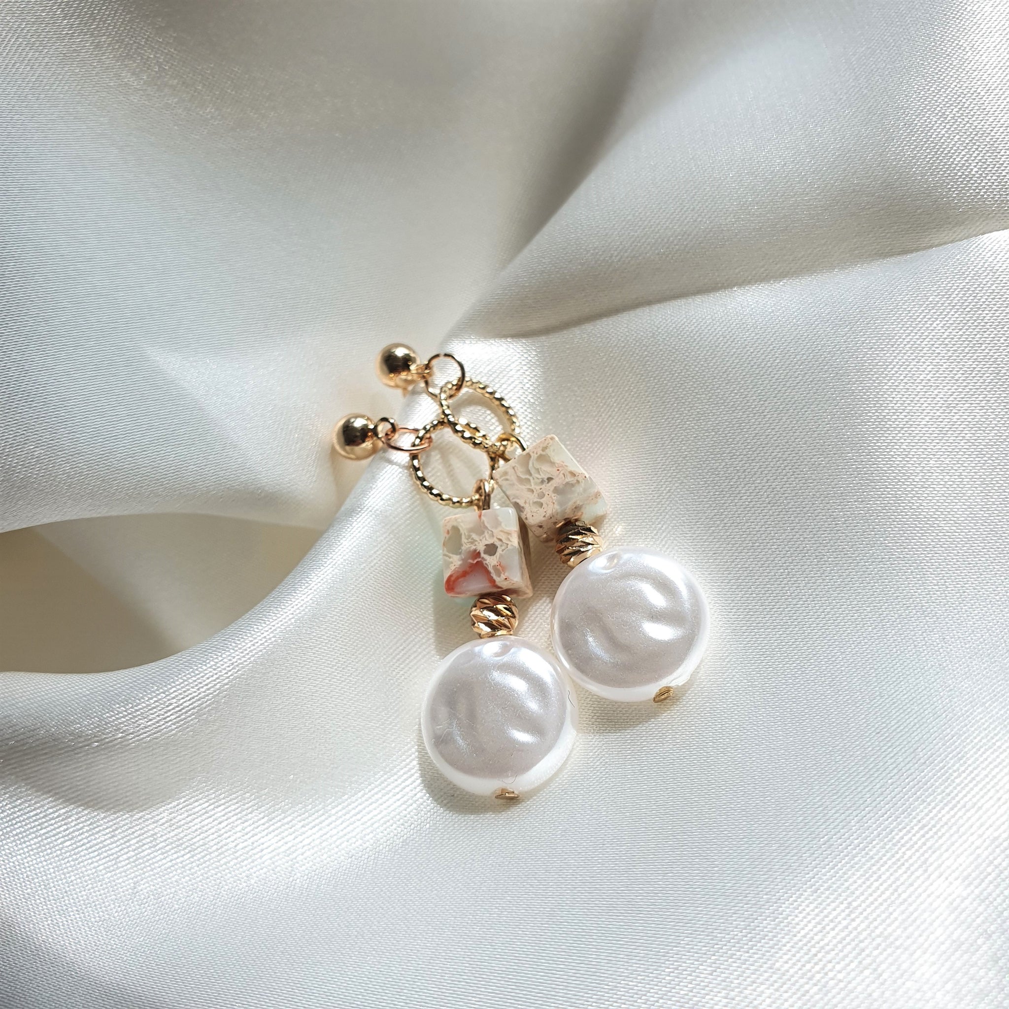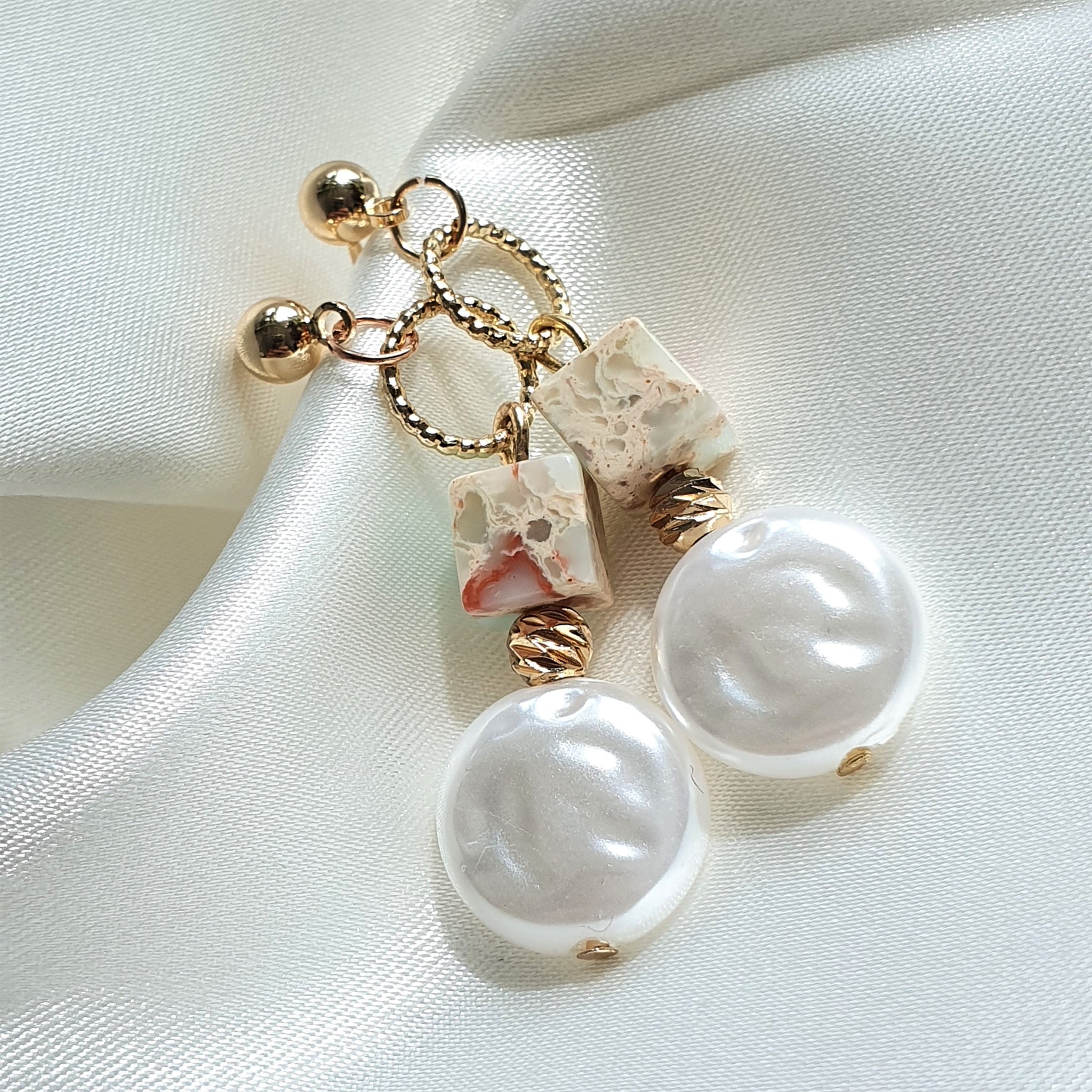 Made using natural marble stones (in a lovely mixture of red, pink and light blue) and pearl stones.